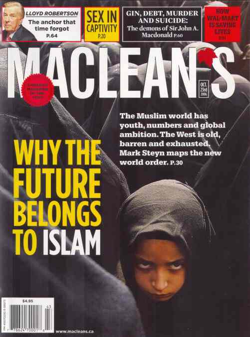 The story, in short: In October 2006, Maclean’s Magazine published an article by Mark Steyn titled “The Future Belongs to Islam.” This article – sprinkled with images that practically scream “be afraid! Be very afraid! It’s the Muslims! Ruuuunnnn!” – is actually an excerpt from the author’s book “America Alone,†and was the feature story of that month’s issue.