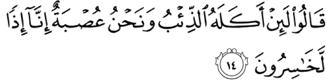 They are saying, “We take care of everything. Do you think a wolf is going to be able to do this? We are a whole group of people. We are constructing and building, and we are taking care of the goats and sheep, and now you think that a wolf will do this?” It is clear that Ya‘qub’s excuse is not strong, and they know it. As for the first meaning of Ya‘qub being sad, they do not say anything because they know that it is true, and they cannot say anything about this and let it go. For the second point, they say, “How is this possible when we are an ‘usbah?”