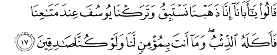 They said, “Oh our father, we went racing one another, and we left Yusuf with our belongings (food, vessels, containers, meat) and all that we came to have the picnic with because he was the youngest. We are the elders and were playing (some type of race or hide-and-seek) and had to leave the youngest one. We left Yusuf with our belongings. Oh our father, you gave us the excuse and we did not have this plot in mind. You told us what to tell you. Our minds are not yet that developed, and we are not that imaginative. You are the wise man and gave us what we needed. This is what happened, but we know that you are never going to believe the story even if we were telling the truth. We know that you will never have iman in us.”
