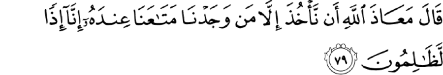 Notice that he was accused of stealing, but Yusuf cannot say ‘the one who stole’ because his brother didn’t steal, so he makes a much longer phrase: the one from whom our belongings was found amongst. Yusuf cannot say ‘the one who stole’ because that is a lie and his brother didn’t steal. Yusuf makes it much longer, but they are not going to catch on. This shows us that even in difficult times you cannot lie and are not allowed to lie. That is why the Prophet (sal Allahu alayhi wa sallam) never once in his life uttered a lie. It is allowed to give double meanings (tawriyah) – we will talk about this when we get to the seerah. You can give a double meaning that you intend one thing and person intends something else. This is a type of tawriyah here because what Yusuf said was understood by the brothers to mean stealing, but he didn’t say stealing. He said ‘the one who had the belongings.’
