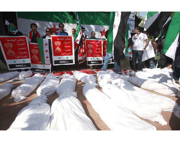Burial shrouds, symbolizing bodies of the protesters who were killed during protests in Syria, are seen at an anti-Syrian government protest in Cairo