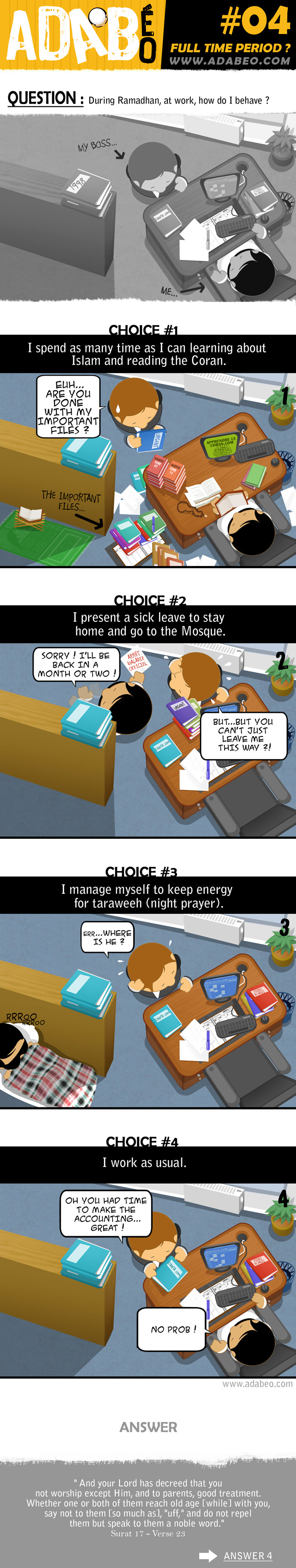 Instead, either we should give the employer(above manager) PRIOR information, that my productivity might come down for the month of Ramadan, or else if he is not ready, then take leave for the whole month after doing tawakkul.