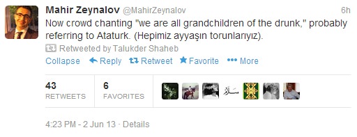 Mustafa Kemal was a well known drunk and died of liver cirrhosis. He was actually quite proud of this fact and referred to himself as “the drunk.” Hence, these protesters refer to themselves as the “children of the drunk.” Meanwhile, Erdogan is pious and a graduate of an Imam Hatip school who has never smelt alcohol. Who would you like to be in charge? The protesters clearly prefer the former.