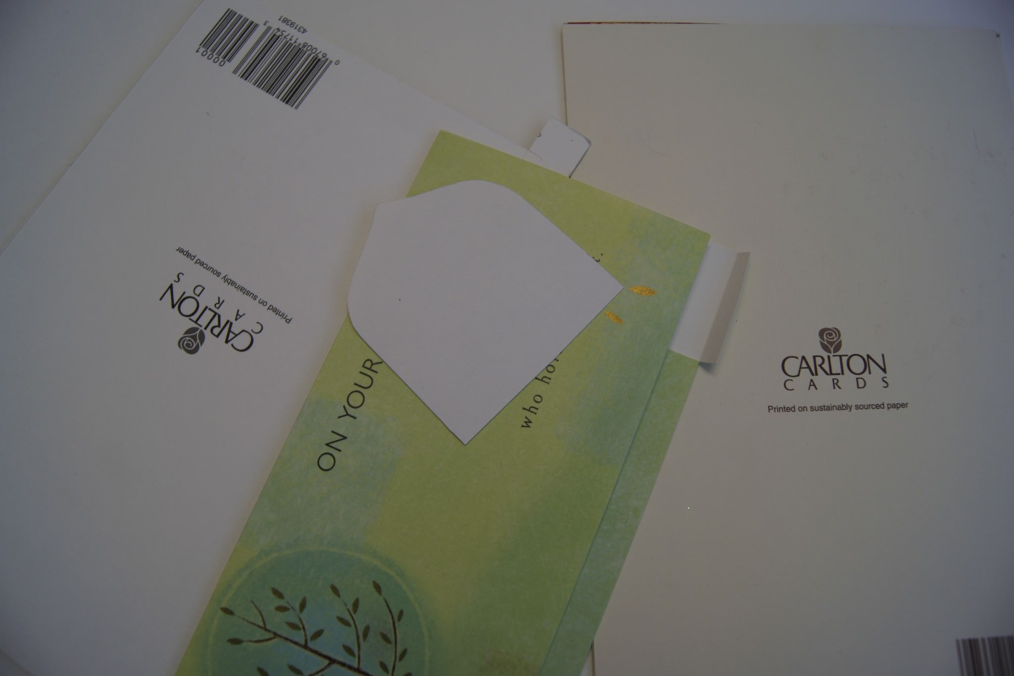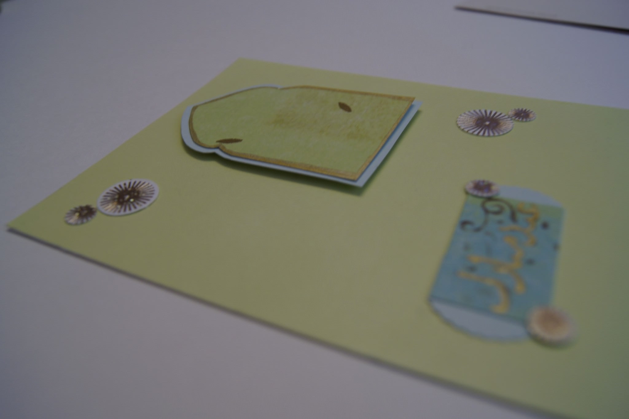 8. So I punched out shiny starbursts from another used greeting card. (You can tell from my other cards that I like blings a tad too much ;))