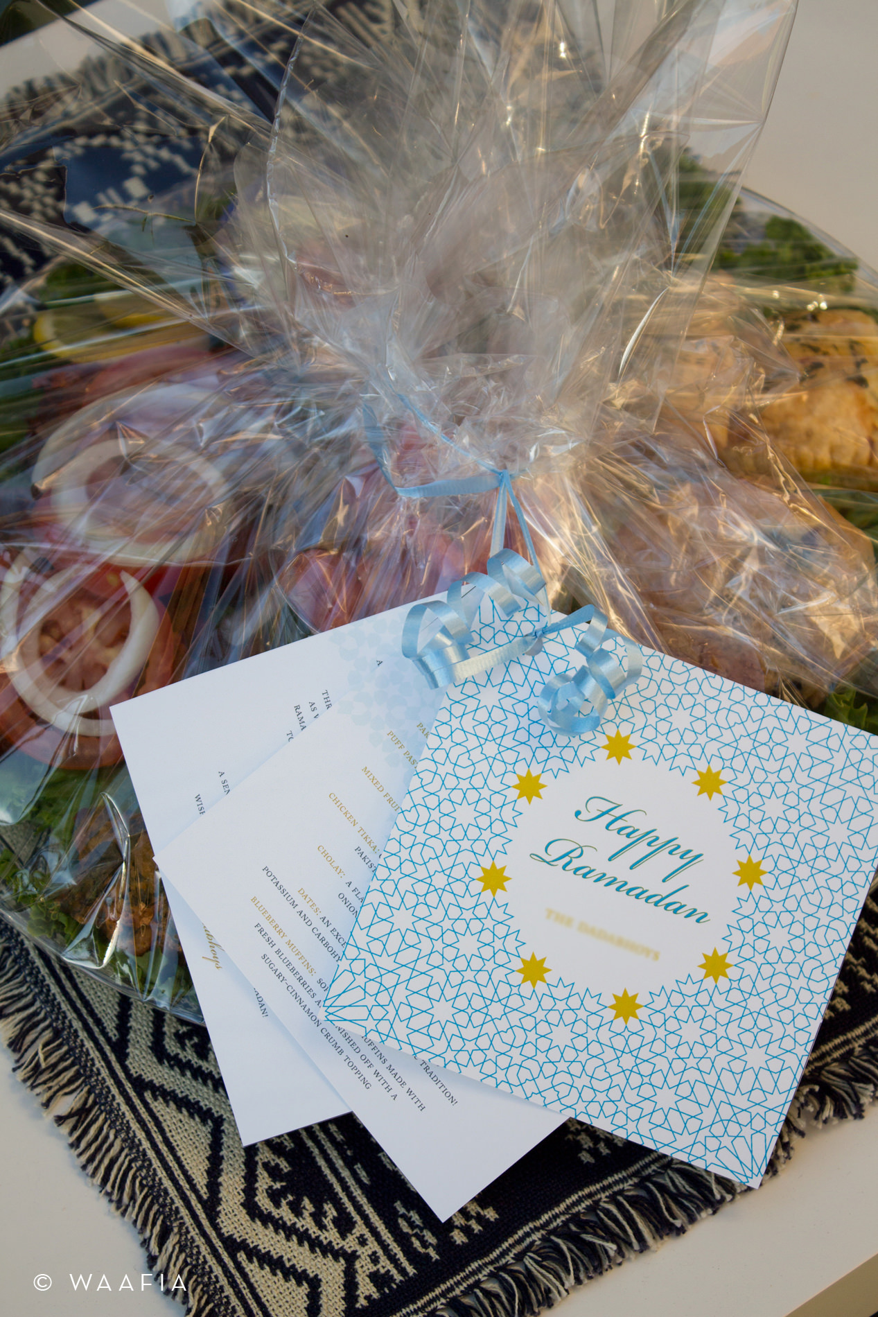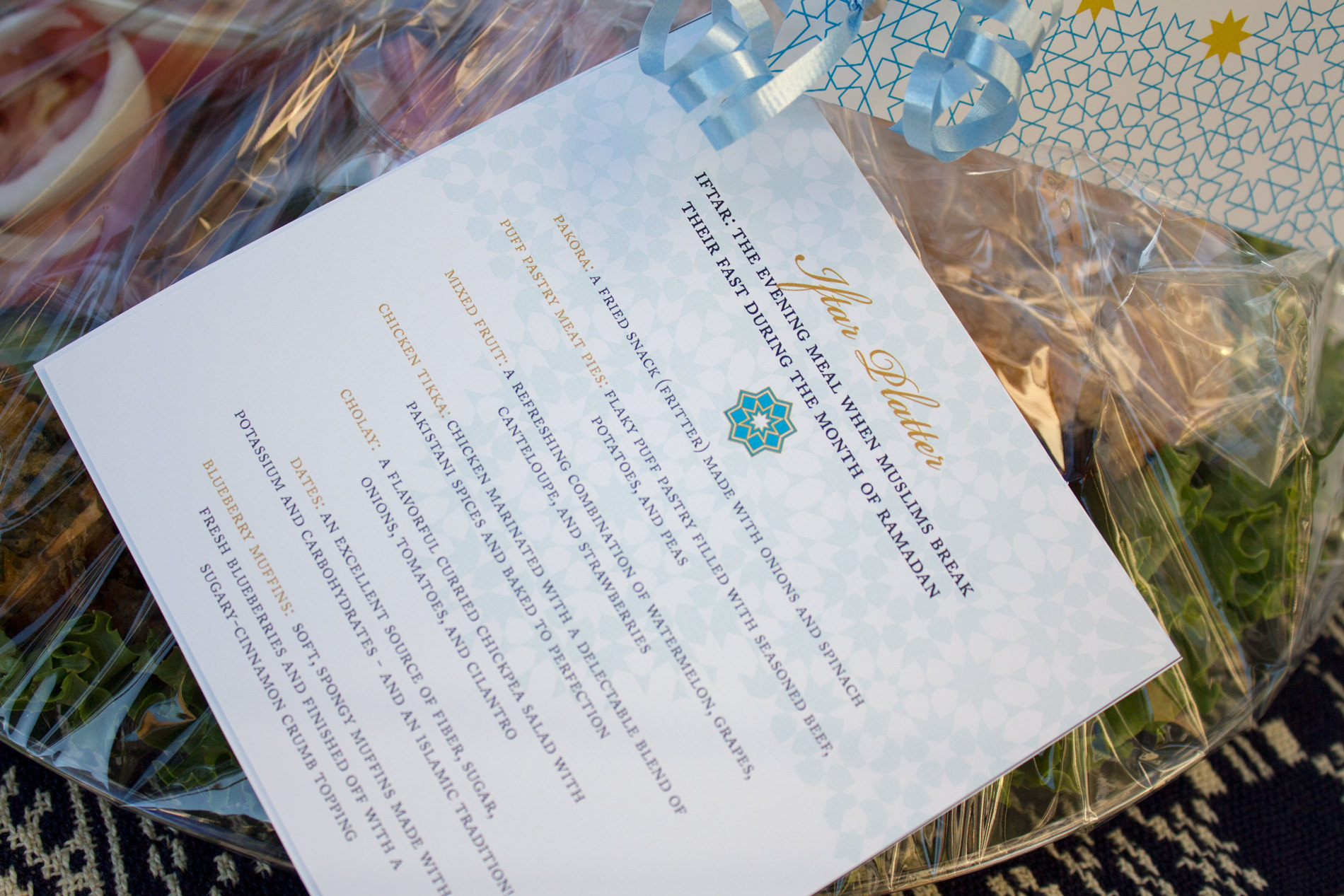 We plated and wrapped up our platters with cello paper and ribbon. Strung from the ribbon were three note cards; a cover wishing everyone a Happy Ramadan from our family, a description of each food item we included, and an informational card with a short summary of what Ramadan means to Muslims.