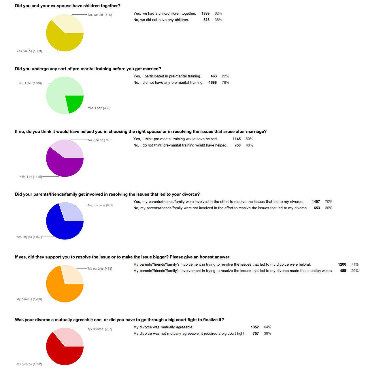 The majority of people partaking in this survey admitted to trying to resolve the issues that arose. This consisted of 95 percent of the respondents putting some sort of input, in order to attempt to mend the marriage. However, a high percentage of people taking the survey also stated that they did not undergo any sort of pre-marital training. The beauty of pre-marital training is that it offers an increase of awareness and knowledge on the topic of marriage. Pre-marital training offers the necessary tools to make a marriage work. It also helps one understand what to do when the topic of divorce arises. While it is fact that this form of training is very helpful, survey takers were almost split when asked, “Do you think it would have helped you in choosing the right spouse or in resolving the issues that arose after marriage?” 60 percent felt it would have helped, with 40 percent remaining firm on the fact that this form of training would not have helped them.