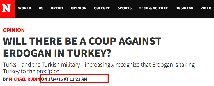 Turkey-watchers will have noted the steady stream of articles talking up a coup in Turkey over the last few months. One article even fantasised about Erdogan and his family being hanged. At the time, it just seemed like journalists hypothesising, but it seems that a few crossed over from speculation to cheerleading.