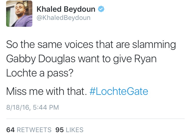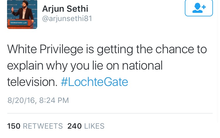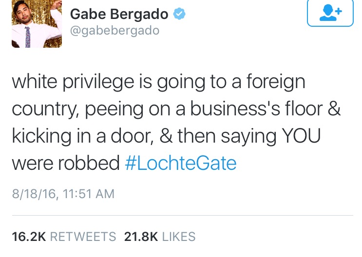On August 15, all parties involved in peeing and property damage were accosted by Rio police. A video showing no sort of piracy surfaced refuting every detail of Lochte’s account. Twitter went to work. #LochteGate, a hashtag that put the evidence of cancerous white privilege on a world forced media to candidness.
