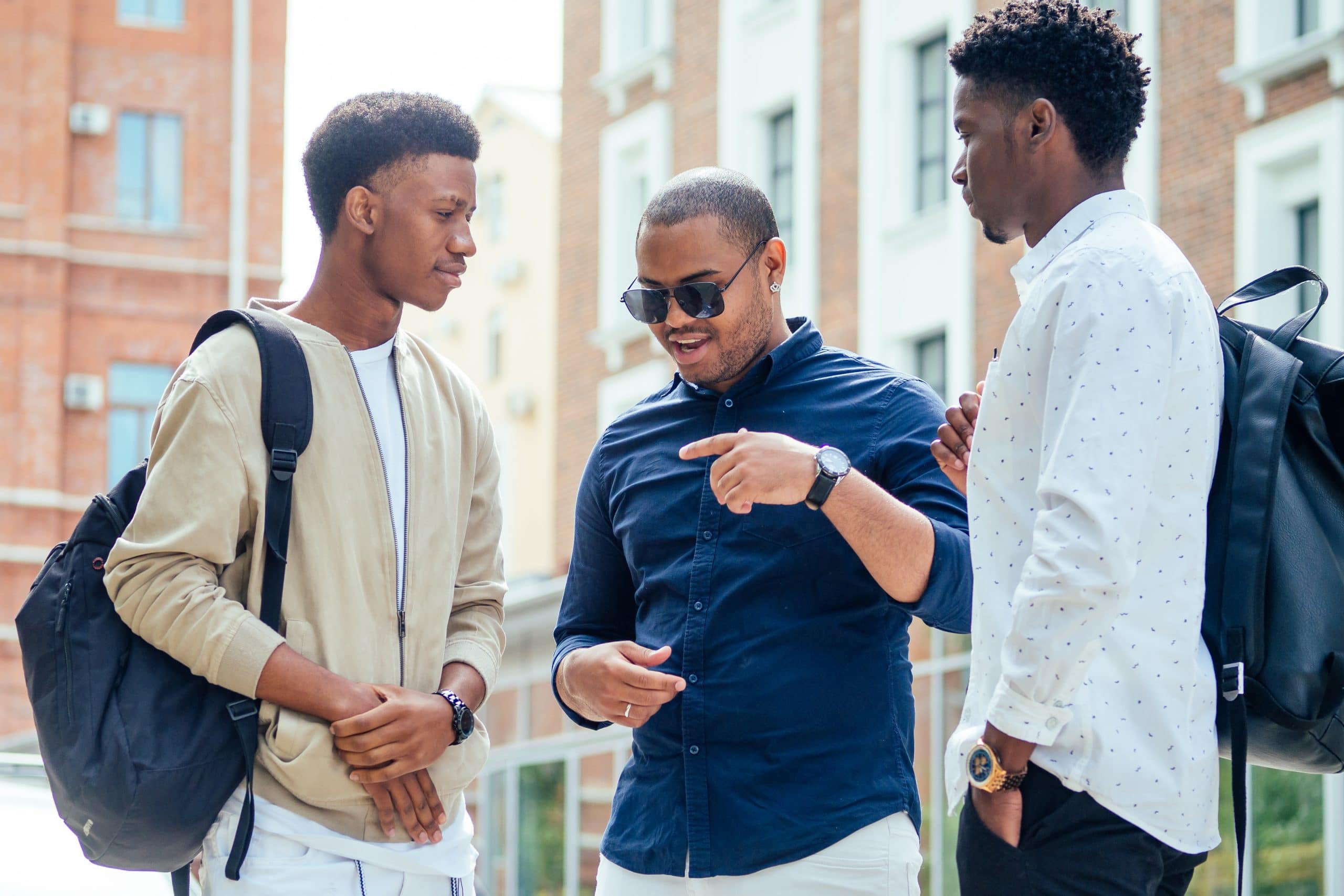 a group of three fashionable well-dressed cool African American guys students communicating on the street