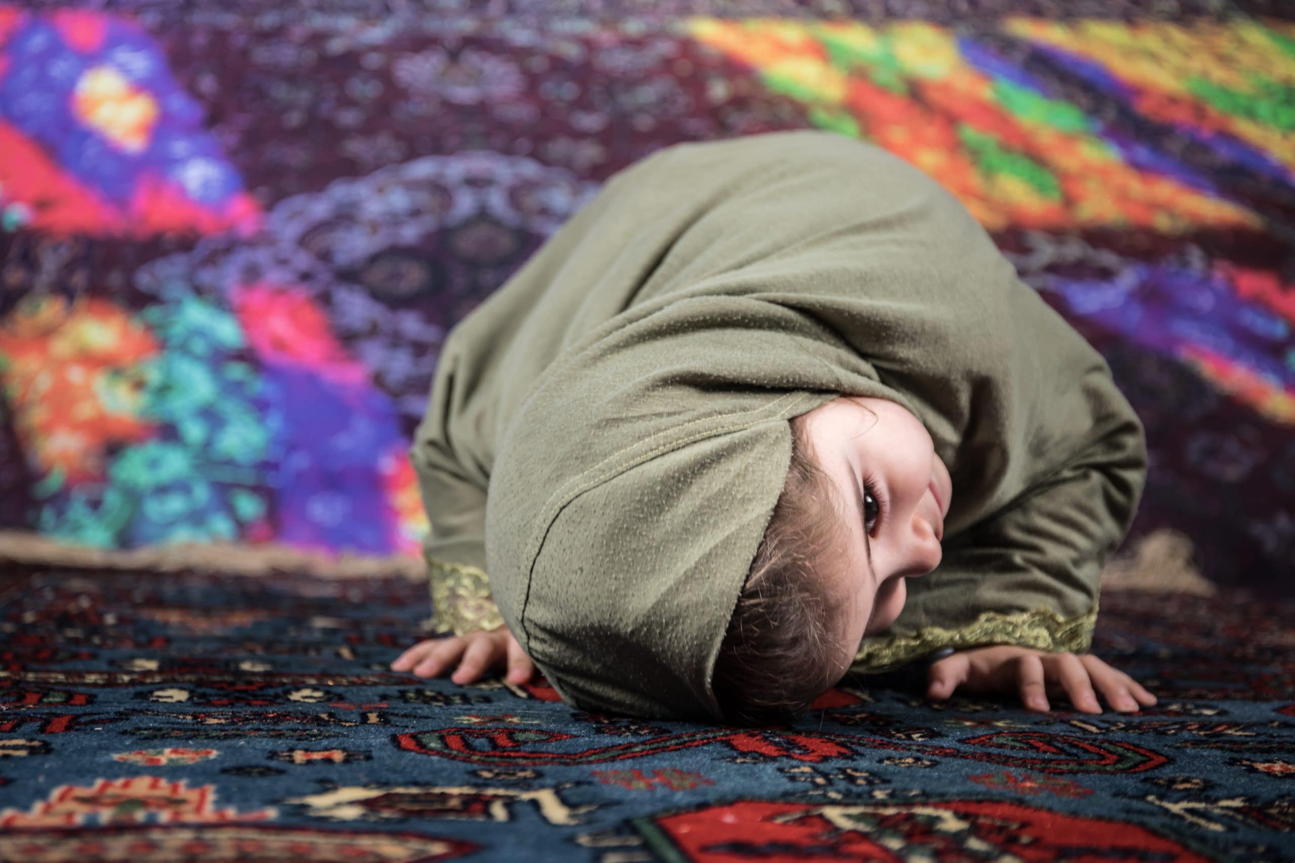 happy muslim girl with full hijab in pink dress , asian traditional style dress , praying inside the mosque and holy Allah