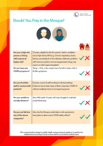 5.1 Educate on who should come to the mosque – This is absolutely vital. If the community don’t know this information and accept it, then everything else will be an uphill struggle. Download it, read it and talk about it. Yes, it will be tough for those who should be praying at home, but even if they want to take the risk – it is not their choice to make for others. Please click here to download.