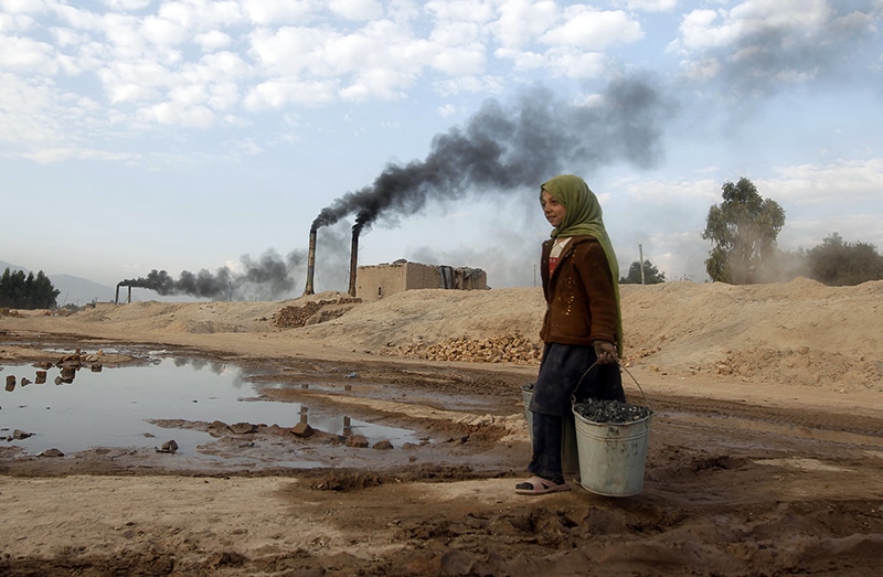 Aisha carries coal to be used for cooking and heating from a brick-making factory in Jalalabad