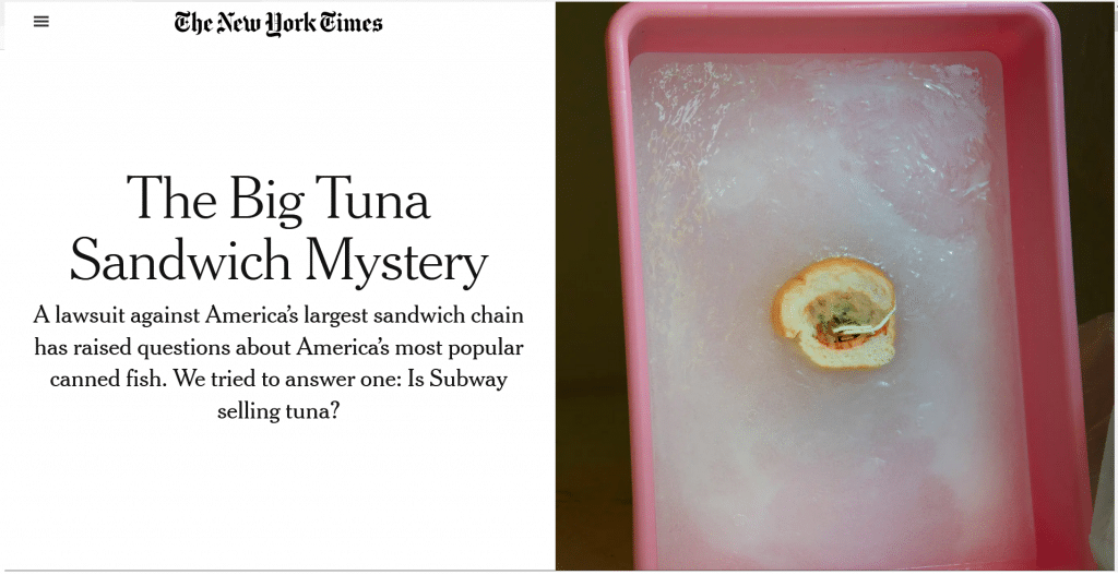 This lawsuit caught the attention of the New York Times, which started its own investigation. After conducting its own testing, the New York Times found “no amplifiable tuna DNA was present” and that they “[could] not identify the species” of whatever food stuffs the samples contained.4 “The Big Tuna Sandwich Mystery,” New York Times https://www.nytimes.com/2021/06/19/style/subway-tuna-sandwich-lawsuit.html All testing of Subway tuna sandwiches hasn’t yielded the same results, however. Testing done by the Inside Edition did identify tuna within the tuna sandwich samples sent to Applied Food Technologies in Florida.5“Is Subway’s Tuna Sandwich Actually Made of Tuna?” Inside Edition https://www.youtube.com/watch?v=ETqb9Umlo8A In 30 DNA tests on 150 pounds of Subway’s tuna, an AFT spokesperson said, “in every sample tested, we were able to detect skipjack tuna, yellowfin tuna, or both species.” According to Seafood Source,6“Subway defends tuna, top DNA lab asserts widely-publicized tests were inadequate,” Seafood Source https://www.seafoodsource.com/news/foodservice-retail/subway-defends-tuna-as-top-tuna-testing-lab-questions-dna-report AFT is equipped to properly identify processed tuna, whereas the other labs using PCR DNA testing may not have had the proper testing capabilities. USA Today7“Fact check: Social media posts on Subway tuna DNA test lack context,” USA Today https://www.usatoday.com/story/news/factcheck/2021/06/25/fact-check-online-post-subway-tuna-dna-report-missing-context/5325181001/ has also questioned the validity of the New York Times’ investigation.
