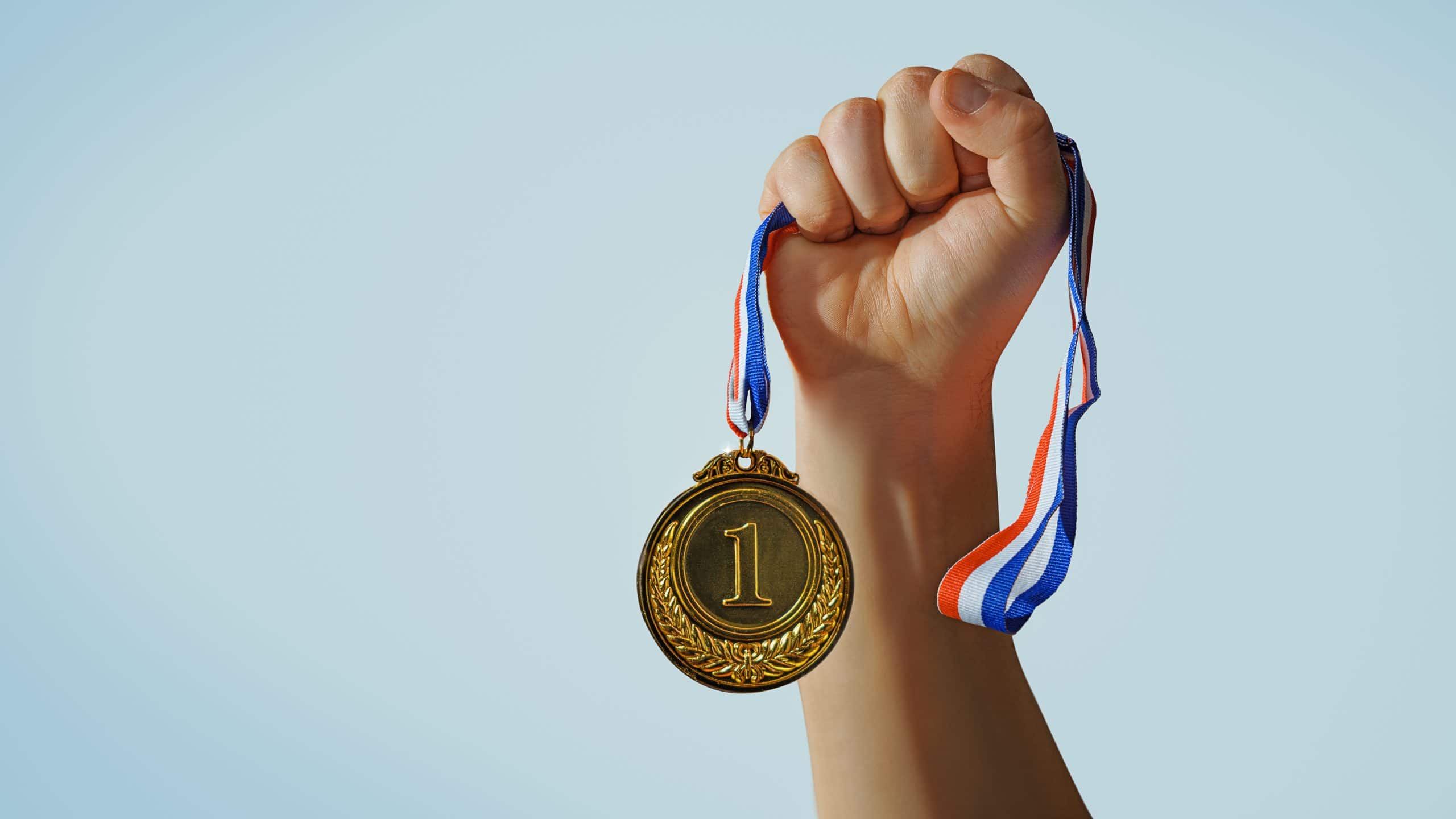 woman hand raised, holding gold medal against sky. award and vic