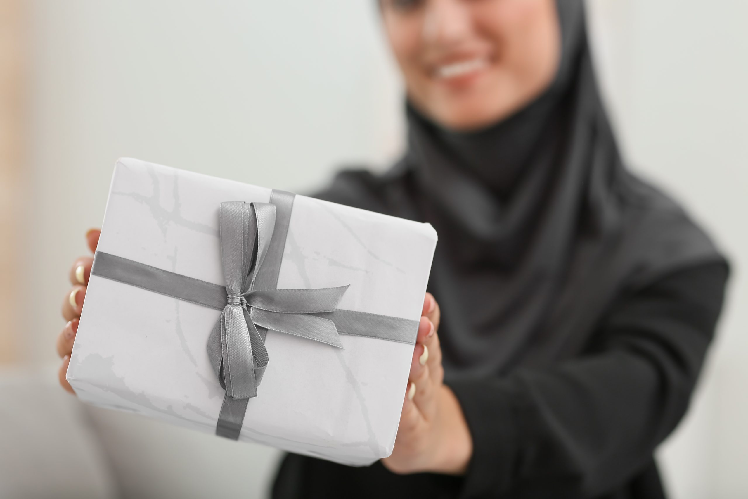 Young Muslim woman with gift at home, closeup