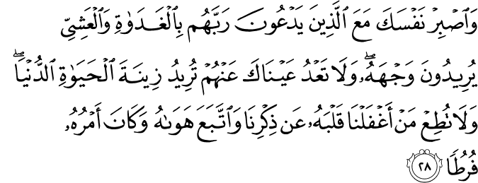 “And keep yourself patient [by being] with those who call upon their Lord in the morning and the evening, seeking His countenance. And let not your eyes pass beyond them, desiring adornments of the worldly life, and do not obey one whose heart We have made heedless of Our remembrance and who follows his desire and whose affair is ever [in] neglect.” [Surah Al-Kahf: 18;28]