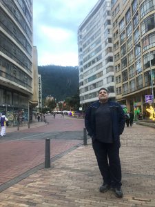 It’s only 68 degrees Fahrenheit in Bogota today, but when the sun hits you it feels like being baked alive. Bogota is at 9,000 feet elevation, so the atmosphere is thin. The sun cuts through like a big yellow axe. I see dark-skinned Colombians slathering on sunscreen like war paint. And I’m out here bare-skinned like a dummy.