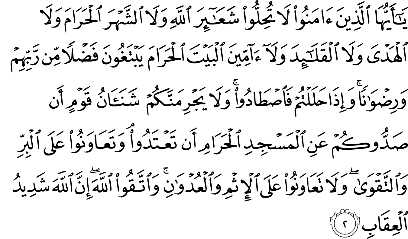 “O you who have believed, do not violate the rites of Allah or [the sanctity of] the sacred month or [neglect the marking of] the sacrificial animals and garlanding [them] or [violate the safety of] those coming to the Sacred House seeking bounty from their Lord and [His] approval. But when you come out of ihram, then [you may] hunt. And do not let the hatred of a people for having obstructed you from al-Masjid al-Haram lead you to transgress. And cooperate in righteousness and piety, but do not cooperate in sin and aggression. And fear Allah; indeed, Allah is severe in penalty. [Surah Al-Maidah: 5;2]