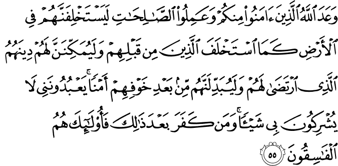 “Allah has promised those of you who believe and do good that He will certainly make them successors in the land, as He did with those before them; and will surely establish for them their faith which He has chosen for them; and will indeed change their fear into security—˹provided that˺ they worship Me, associating nothing with Me. But whoever disbelieves after this ˹promise˺, it is they who will be the rebellious.” [Surah An-Nur: 24;55]