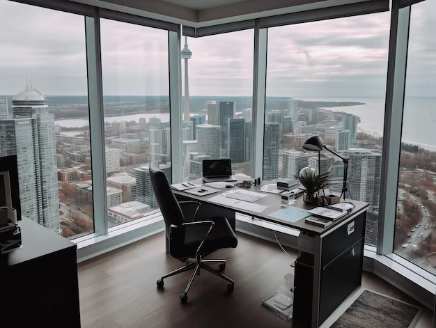 Location: A corner office in a New York skyscraper. An amazing view from the window.