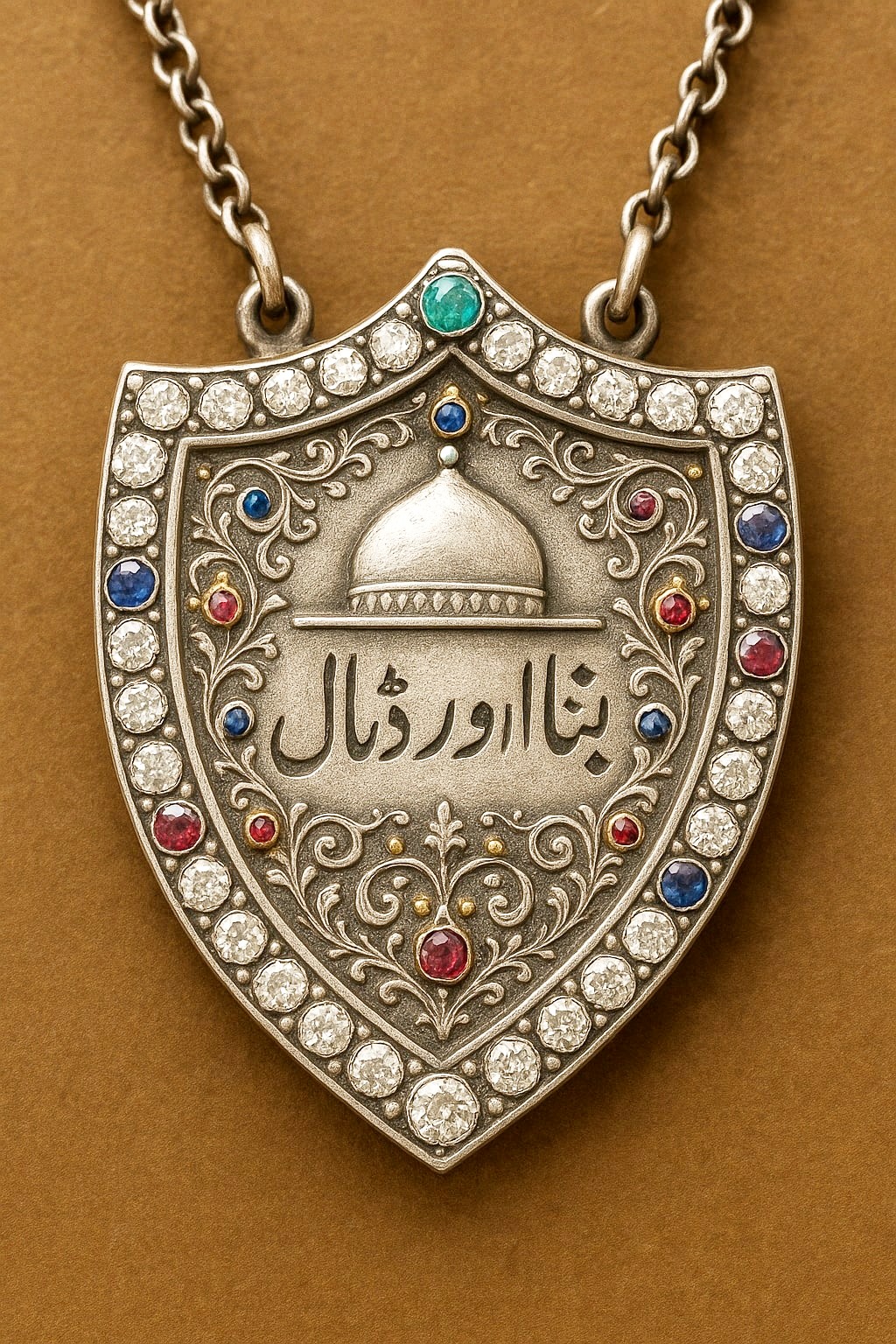 “I do have this, though,” Murid added. He reached under his shirt and pulled out a pendant on a chain. It was a large silver pendant shaped like a shield, lined with diamonds, sapphires and rubies. It bore the image of a Mughal dome, with an Urdu inscription in the center. The gems caught the light from the overhead chandelier and flashed, casting shimmering rays of light in every direction. A few of the women around the table gasped audibly.