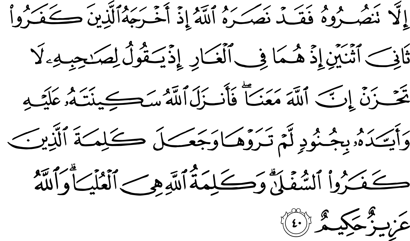 “If you do not aid the Prophet – Allah has already aided him when those who disbelieved had driven him out [of Makkah] as one of two, when they were in the cave and he said to his companion, “Do not grieve; indeed Allah is with us.” And Allah sent down his tranquillity upon him and supported him with angels you did not see and made the word of those who disbelieved the lowest, while the word of Allah – that is the highest. And Allah is Exalted in Might and Wise.” [Surah At-Tawbah: 9;40]