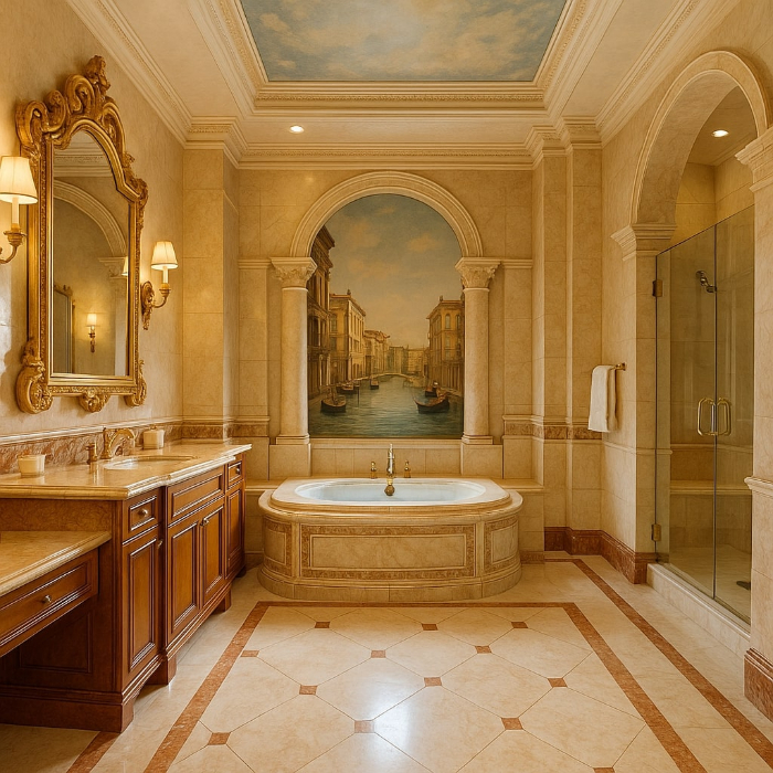 Deek checked into the Venetian Suite, on the fourth floor. For a moment he simply stood in the doorway, the keycard warm in his hand, as his eyes swept across the room. Everything glowed in sun-washed gold—cream-colored drapes drawn open to tall windows, a vaulted ceiling painted with soft clouds, and polished marble floor that caught the light like water. The silence was broken only by the delicate sound of trickling water.
