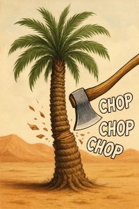 Not now, though. Not today, when she was a date palm tree of her native Iraq, and the events of the day were swings of an axe, chopping her down. Her back pain – CHOP. The child’s passing – CHOP. Her weariness, sweaty face, and red eyes, making her look altogether ugly – CHOP. And now Deek showing up without warning, looking like an Arab cinema star – CHOP.