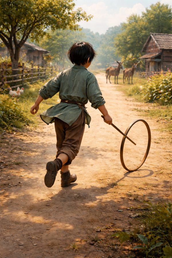 One workday afternoon, when Haaris and I had finished our work early as usual and Ma Shushu had no patients, I sat on the wall beside the front gate, watching Haaris play stick and hoop. He had a wooden hoop he had made by curving a slender bamboo shoot and binding the ends together. He would roll it along, using the stick to keep it moving.