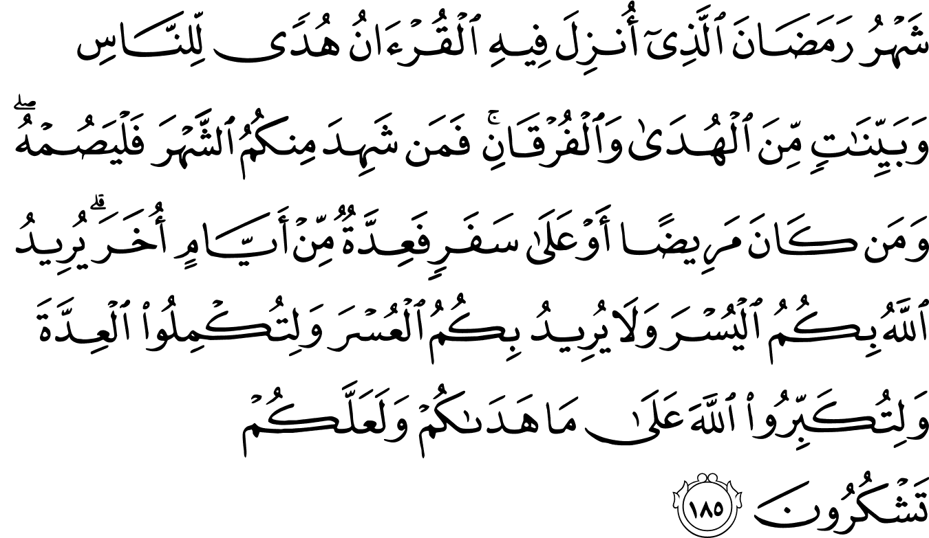 “Ramaḍân is the month in which the Quran was revealed as a guide for humanity with clear proofs of guidance and the decisive authority. So whoever is present this month, let them fast. But whoever is ill or on a journey, then ˹let them fast˺ an equal number of days ˹after Ramaḍân˺. Allah intends ease for you, not hardship, so that you may complete the prescribed period and proclaim the greatness of Allah for guiding you, and perhaps you will be grateful.” [Surah Al-Baqarah; 2:185]
