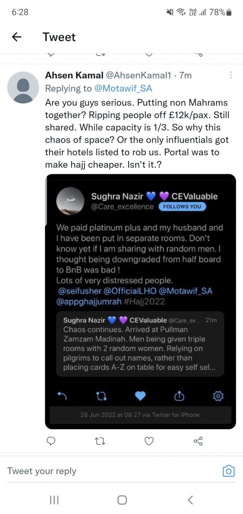 - Hujjaj made it to the hotel but were then not given what they paid for and either no-longer had half-board but breakfast only, or no longer had twin share but had to share a room and were separated from their spouses and loved ones. Allegations that pilgrims were sharing rooms with non-mahram men have been made on social media.