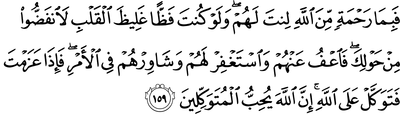 “So, it is through mercy from Allah that you are gentle to them. Had you been rough and hard-hearted, they would have dispersed from around you. So, pardon them, and seek Forgiveness for them. Consult them in the matter and, once you have taken a decision, place your trust in Allah. Surely, Allah loves those who place their trust in Him.” [Surah ‘Ali-Imran: 3;159]