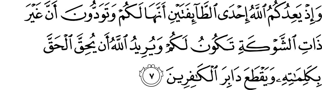 “When Allah promised you one of the two groups – that it would be yours – and you wished that the unarmed one would be yours. But Allah intended to establish the truth by His words and to eliminate the disbelievers.”