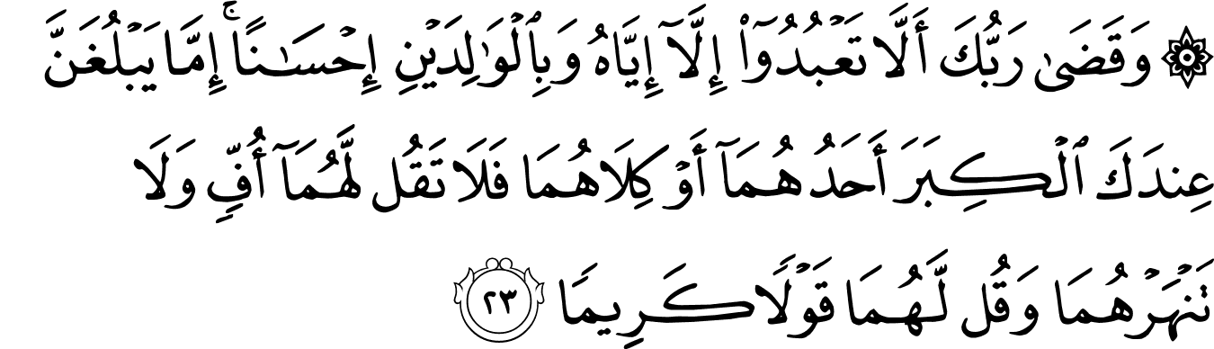 “And your Lord has decreed that you not worship except Him, and to parents, [show] excellent treatment. Whether one or both of them reach old age [while] with you, say not to them [even] ‘uff’ and do not repel them but speak to them a noble word.” [Surah Al-Isra; 17:23]