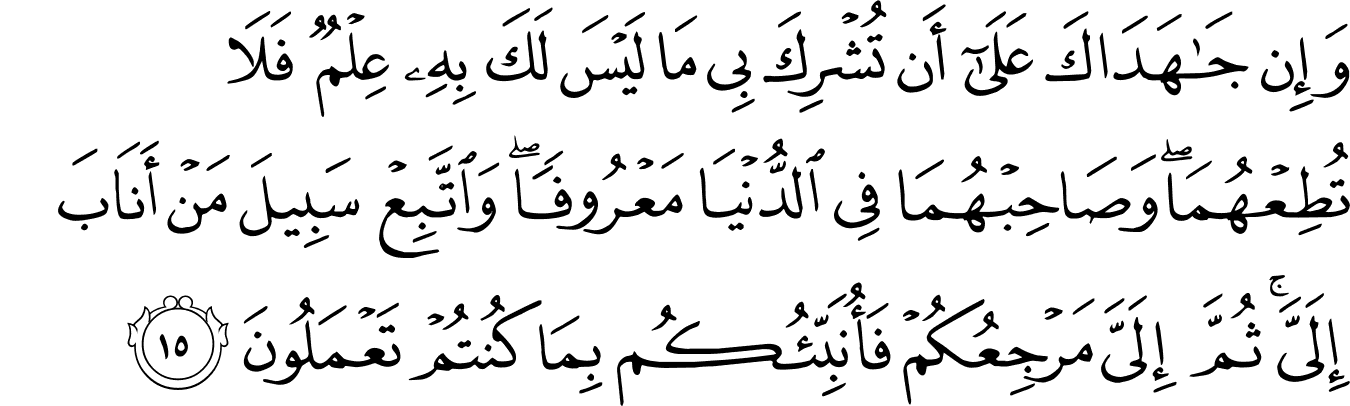 “But if they endeavor to make you associate with Me that of which you have no knowledge, do not obey them but accompany them in [this] world with appropriate kindness and follow the way of those who turn back to Me [in repentance]. Then to Me will be your return, and I will inform you about what you used to do.” [Surah Luqman; 31:15]